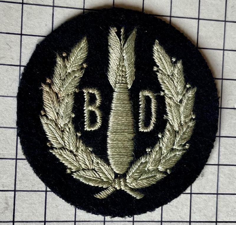 British Royal Air Force Bomb Disposal trade badge from the World War II era. It was authorised in January 1941 for armoury technicians responsible for making unexploded bombs safe. The circular patch features the letters 'B D' surrounding a bomb, all enclosed within a laurel wreath. The badge was typically worn on the upper right sleeve of a uniform. GC.
