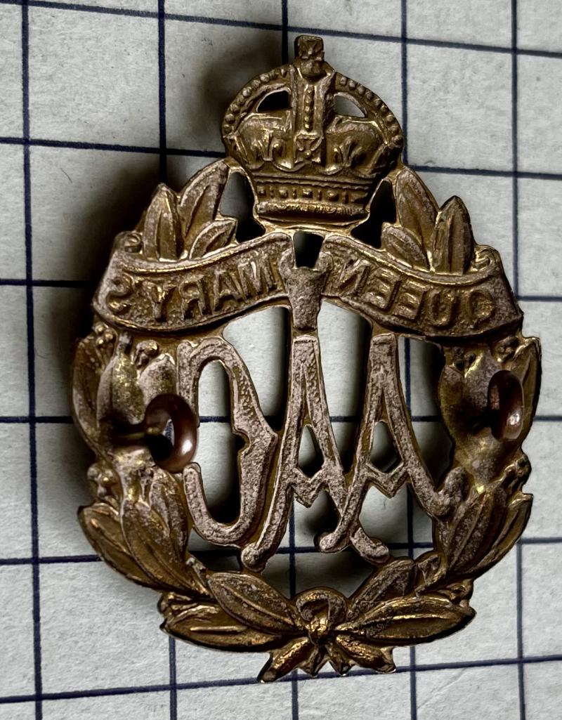 A scarce original First World War (WWI) period 'Queen Mary's Army Auxiliary Corps Q.M.A.A.C. cap badge'; die-stamped brass Crowned wreath of laurels, Queen Mary's on a double scroll immediately below the crown, with 'A.A.C.' within the wreath. Very good condition, complete with lugs East to West.
