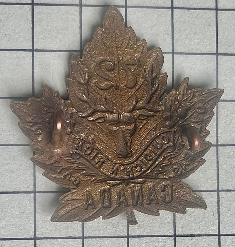 cWWI, 72nd Canadian Battalion (Seaforth Highlanders) Combined Expeditionary Force (C.E.F.) Scarce Great War period die-stamped brass issue of Maple leaf pattern. Loops. VGC.
