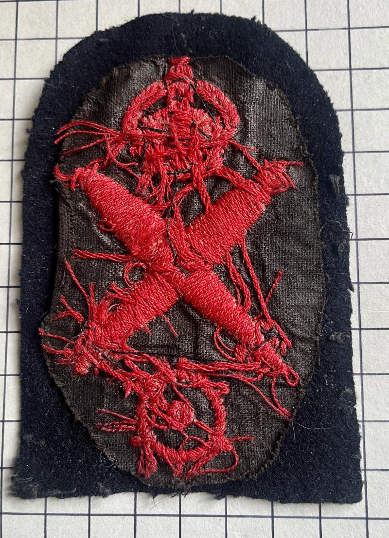 cWWII, R.N. Torpedoman Coxswain branch badge with crossed torpedos, wheel and king's crown woven in red on a tombstone patch. Removed from uniform. GC.