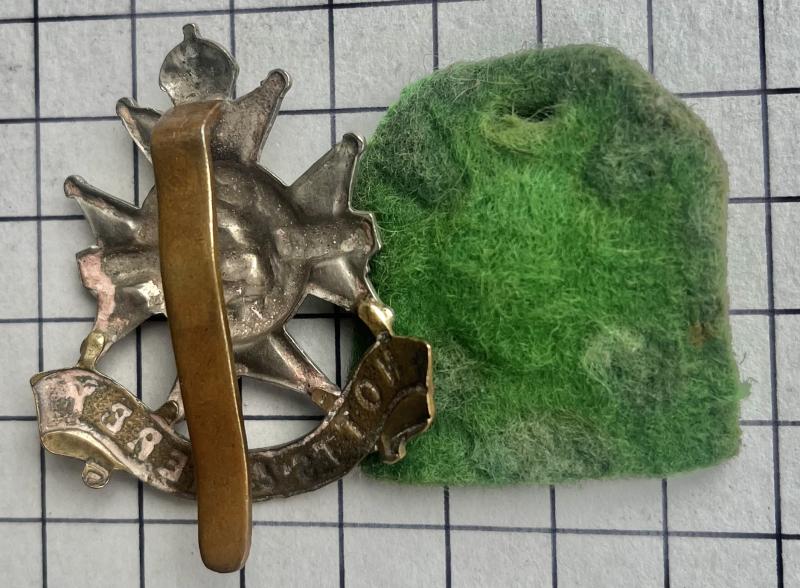 Notts & Derby Cap Badge A bi-metal cap badge for The Sherwood Foresters (Nottinghamshire & Derbyshire Regiment) with slider and green feet backing material. Polished. Ref: KK662.