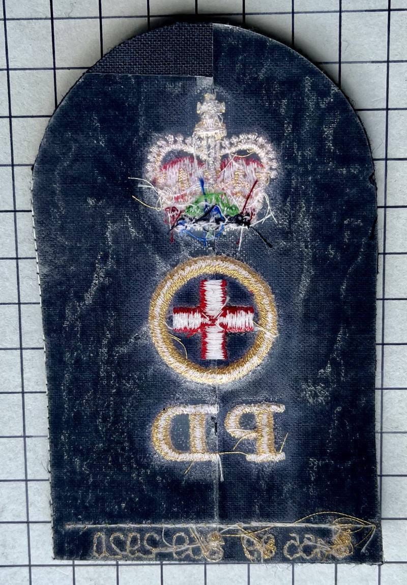 R.N. Pharmacist Dispenser Patch: Part of the Medical Branch (formerly Sick Berth Branch). Features the letters "PD" identifying the specific "Pharmacy Dispenser" trade sub-specialisation. The Queen's Crown denotes the rank of Petty Officer (PO), usually worn on the right-hand arm. VGC.