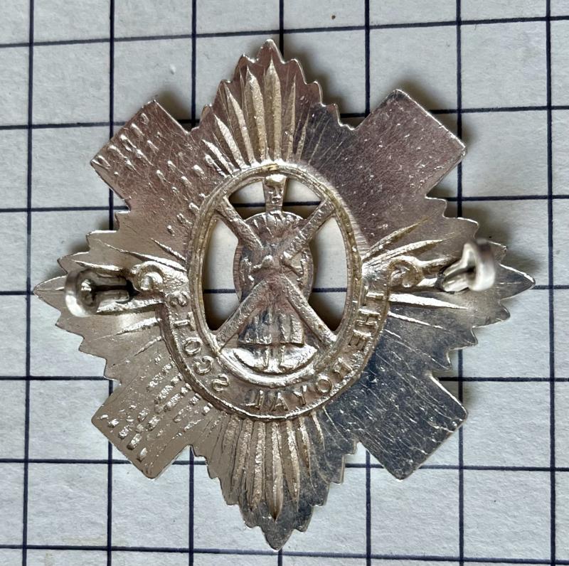 Royal Scots (The Royal Regt) silver & gold ano staybrite cap badge in very good condition.
