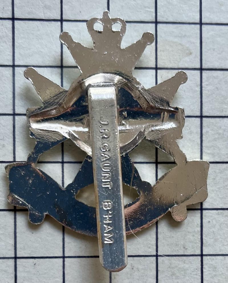 Notts and Derby ano Staybrite cap badge in very good condition. Made by J R GAUNT B'HAM (BIRMINGHAM).