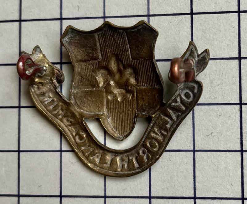 Unusual, gilding metal die-struck. Loyal North Lancs scroll as the '1911 edition' slightly modifies the collars description "as for tunic, but smaller with a scroll as per forage cap". Gilding metal (not the usual bronze OSD collar) this pattern (with scroll) is the same material, same die struck and same pattern as worn by officers on the pagri / sun hat". However, the lugs are not long enough?. Therefore, possibly an Offrs' forage hat badge. GC.