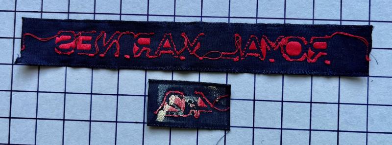 Two piece 'cash tape' 42 and separate RM for wear on the Battle Dress (BD). Missing the 'Commando'. WWII.