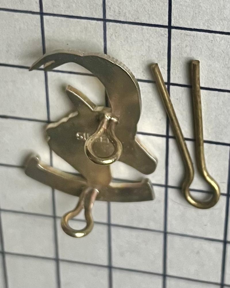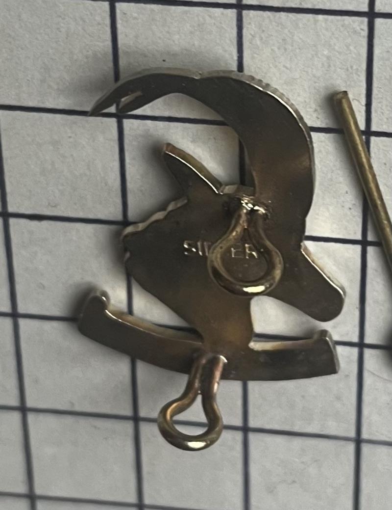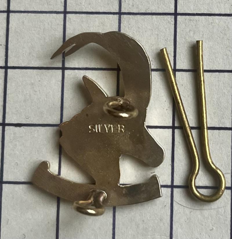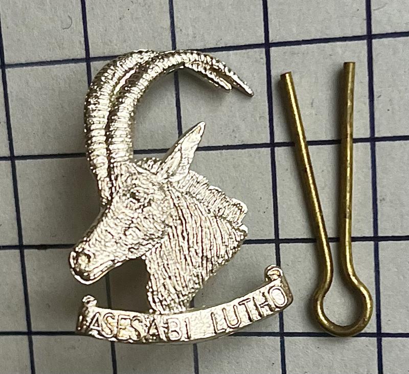 Rhodie silver Officer issue made by Reuteler, Salisbury. Armoured Car Regiment scarce bush war era c1972-80. Marked 'SILVER'. VGC with its packet of issue (opened). Worn as cap badge with a 'mini bar' underneath and also a collar.
