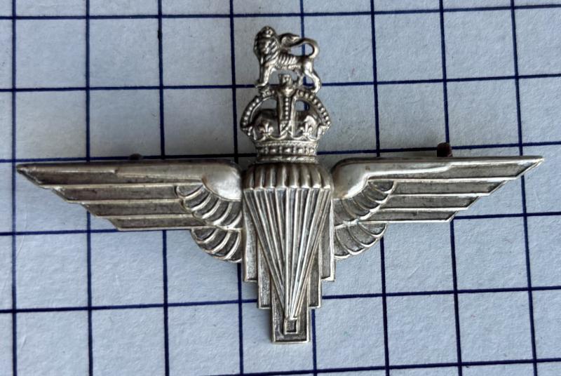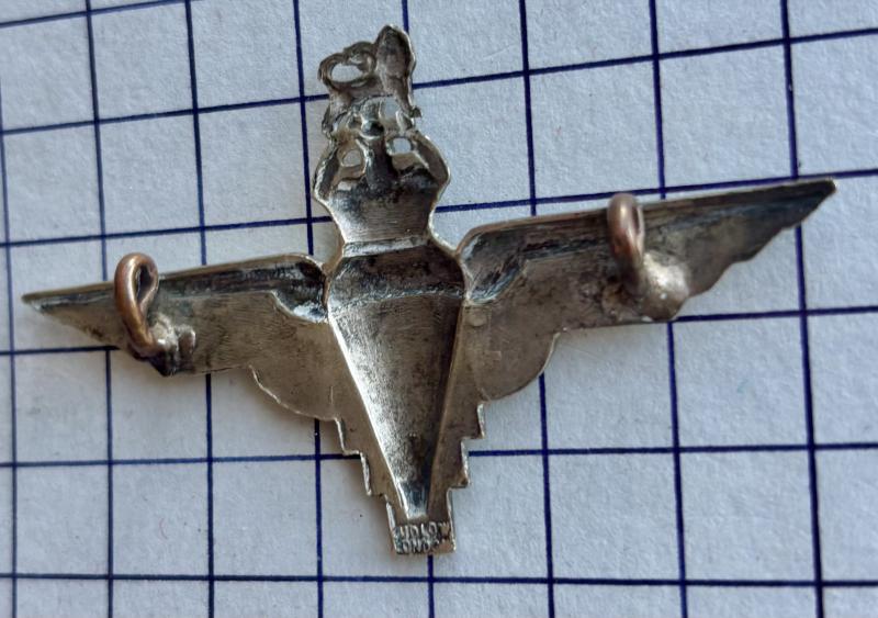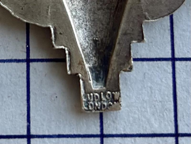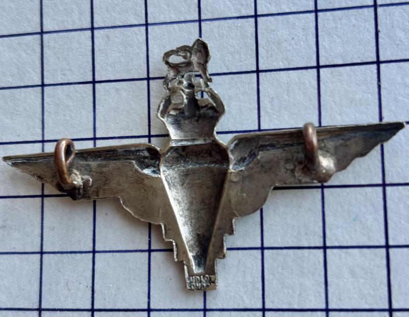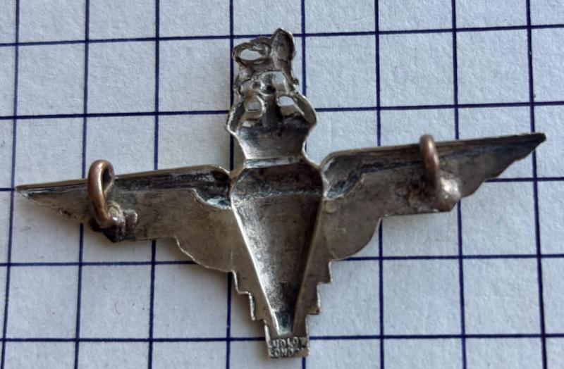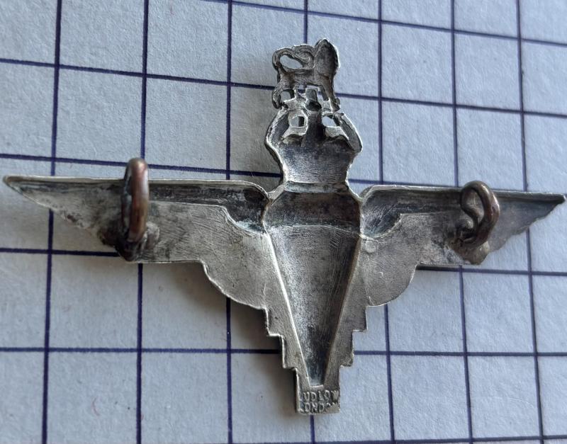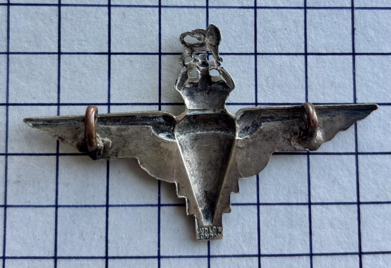 cWWII, Silver (unmarked) Para Regt Offr's Patt cap badge. Maker marked 'LUDLOW LONDON' scarce, wartime Special Forces cap badge. Lugs bent but in place. GC.