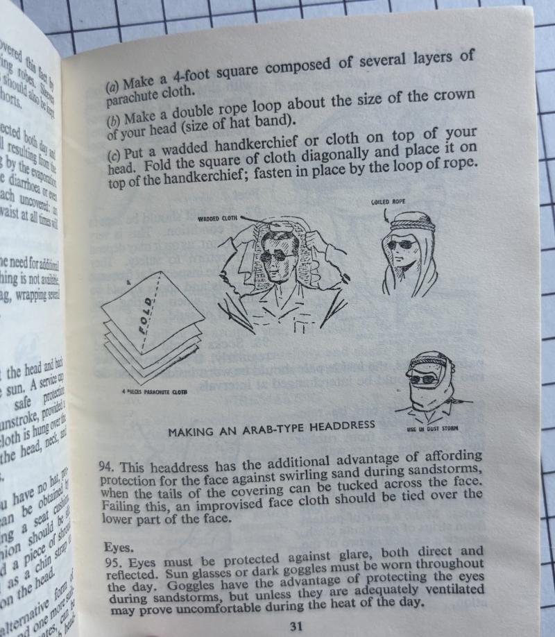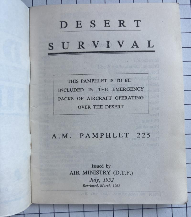 Royal Air Force desert survival pamphlet for aircrew operating over deserts. Held in the survival pack on board aircraft. Dated 1963. GC.