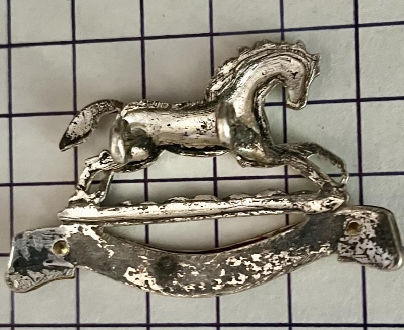The Queen's Own Hussars (QOH) 1958-1993, silver-plate (some nice tarnish/patina) and gilt Officers' metal cap badge on loops. GC.