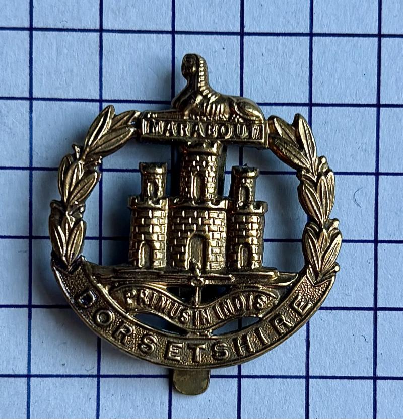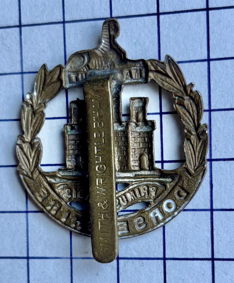 WWI Great War Economy Dorset Regt all brass cap badge. Maker marked 'SMITH & WRIGHT Ld B'HAM'. VGC.