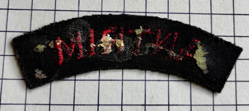 c1957, R.E. 146th (Antrim Arty) Fd Engr Regt shoulder title badge 'Antrim' in RA colours worn below 'Royal Engineers' in RE colours. Some tape mark to reverse, otherwise, VGC.
