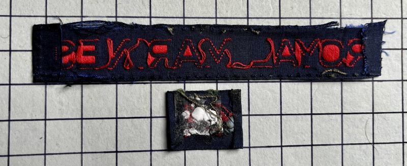 Two piece 'cash tape' 44 and separate RM for wear on the Battle Dress (BD). Removed from uniform. Missing the 'Commando' tab. Cdo WWII.