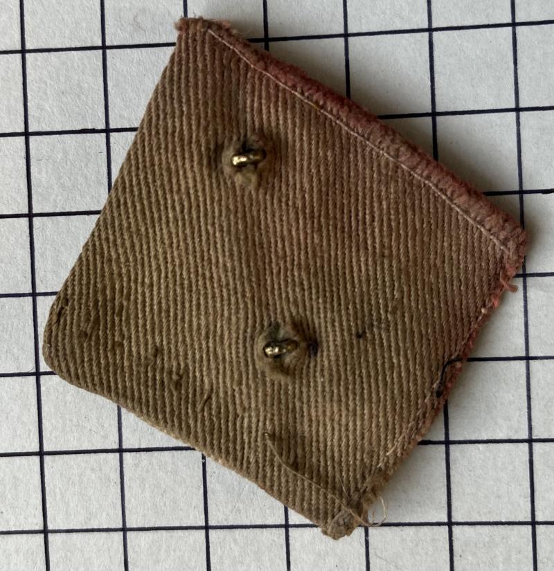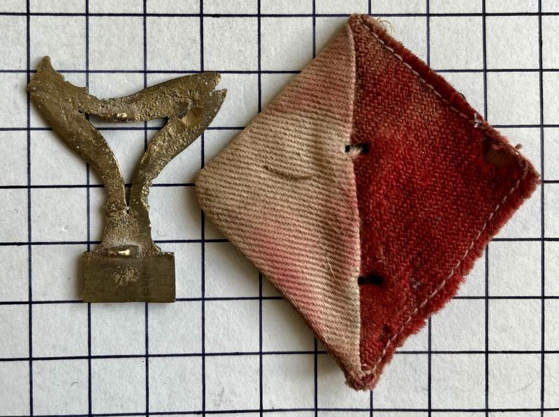 cWWII, a very nice, Ofrrs' Nepal National Army Mahindra Dal locally made cast cap badge with 3 x Kukris surmounted on an inlayed enamelled block with Nagri script. Also, nice to have its cloth backing of Regimental cloth.