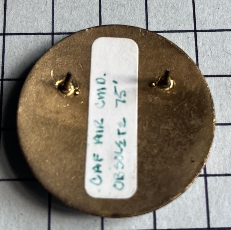 Lovely gilt and enamel pin backed pocket badge R.C.A.F. Air Comd. VGC. Label to rear notes 'disbanded 1975'.