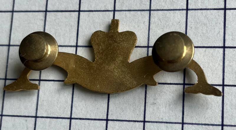 Full sized official 'Royal Navy Submarine Service Submariner qualification breast badge'. pair of dolphins gilt brass early example displaying a Elizabeth II Crowned anchor, flanked by a pair of dolphins cresting, enhanced with red and black enamelling, Excellent condition, complete with original substantial pair of clutch pin fittings and retainers, enamel perfect.