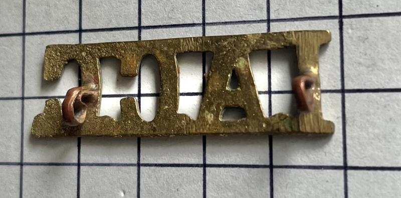 cWW2, I.A.C.C. Indian Army Corps of Clerks shoulder title cast locally made. Bent over loop but intact otherwise GC.