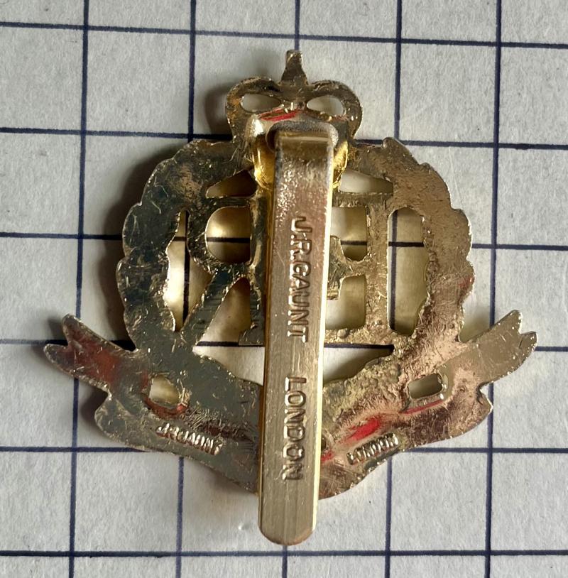 Ano R.M.P. staybrite cap badge maker marked 2x J'R GAUNT LONDON', slider. VGC