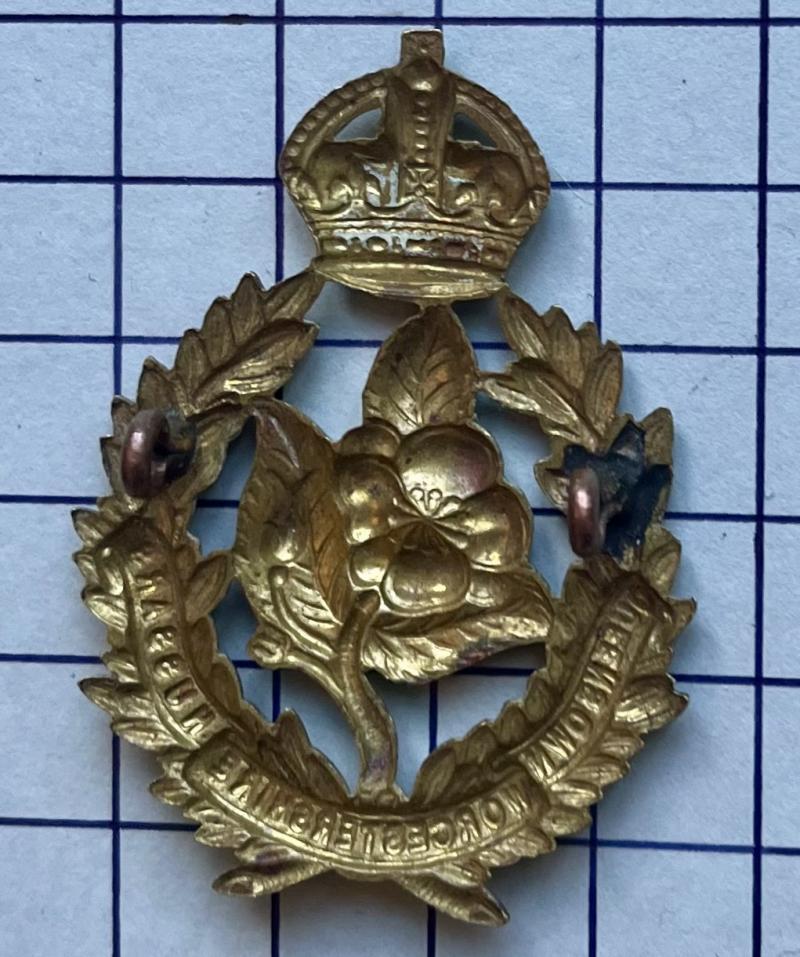 The Queen's Own Worcester Hussars Regt cap badge all brass cap badge on lugs. VGC. Dims: height 53mm.