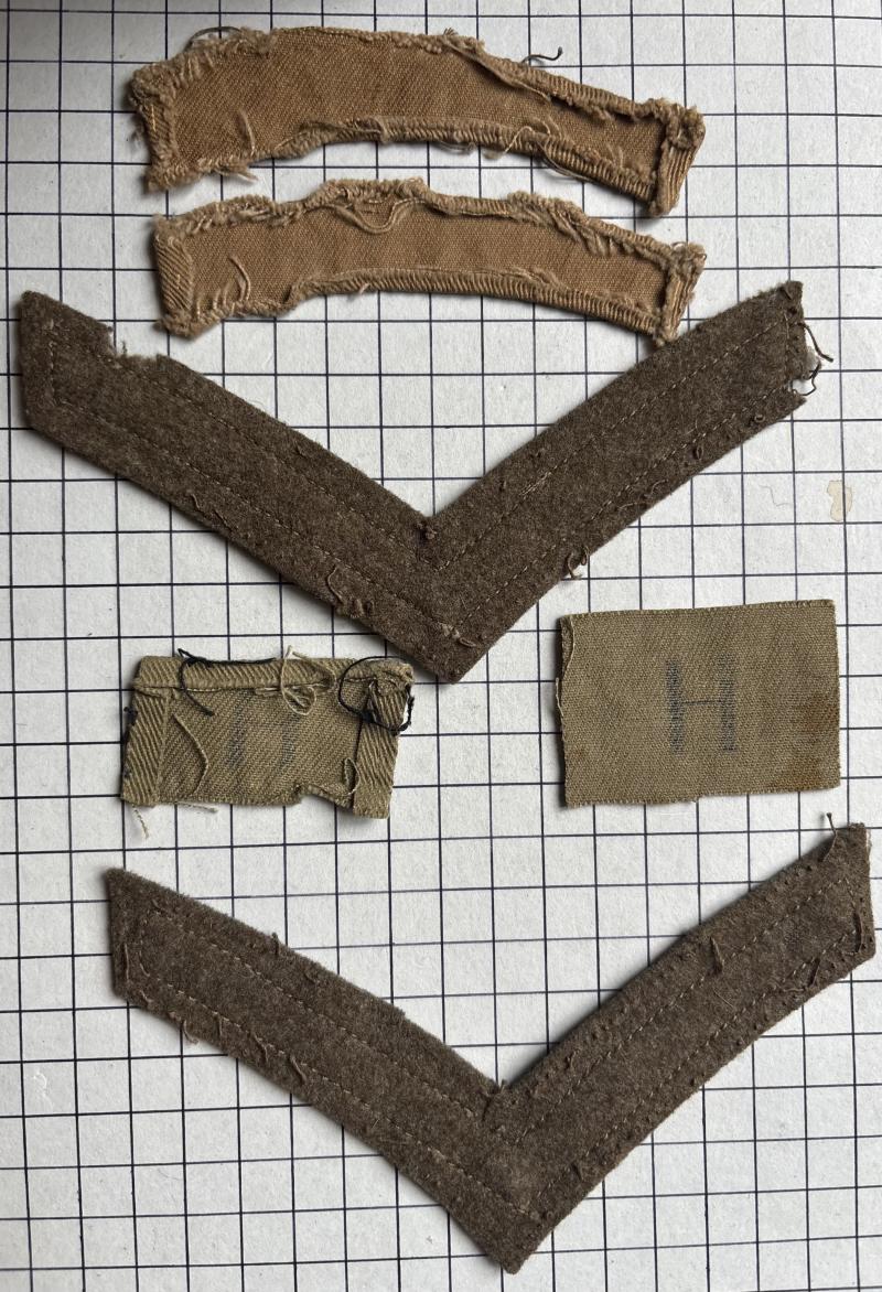 cWWII, Hants H.G. Grouping: 2 x embroidered Lance Corporal Stripes, "H" for Hampshire arm printed patches (1x removed from Battle Dress the other unissued) and 2 x Home Guard printed shoulder title.