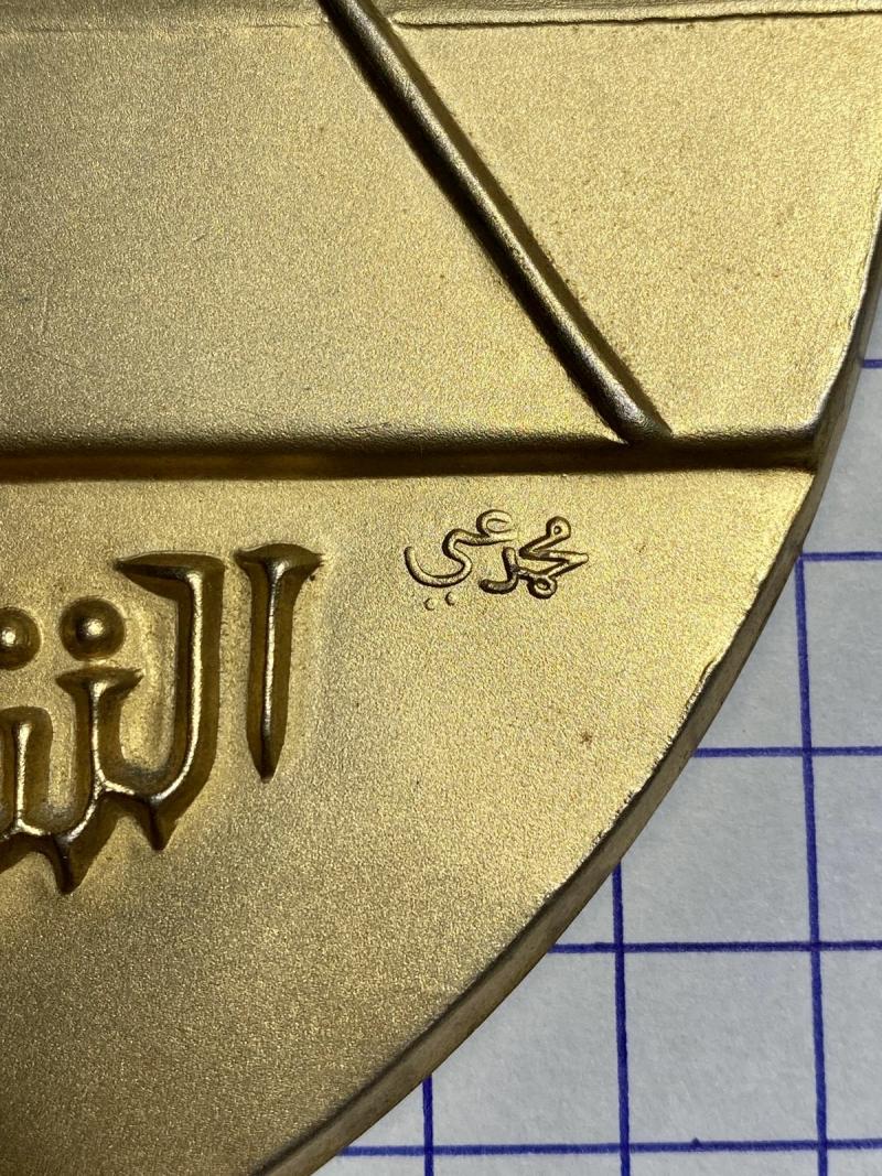 Iraq Martyr's Death Medal / Plaque. The plaque features the Martyr Monument (Al-Shaheed) which includes a helmet and Iraqi flag over a tomb, a tree branch symbolising life, and a rifle (AK47). The plaque was a Government idea to honour Iraq soldiers killed in action. Gilded metal. VGC.