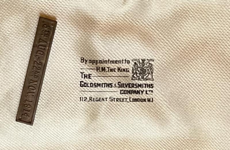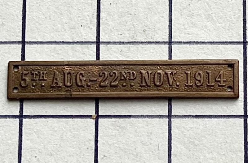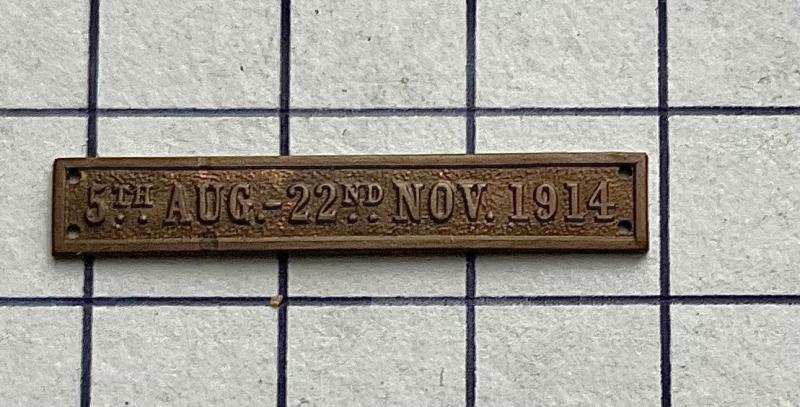 cWWI, 14 Mons sew-on brass bar: '5th Aug - 22nd Nov 1914' for the 1914 Star medal. With a rare private purchase Mons Star leatherette empty box. Velvet flock lined. Maker Regents St London. Both VGC.