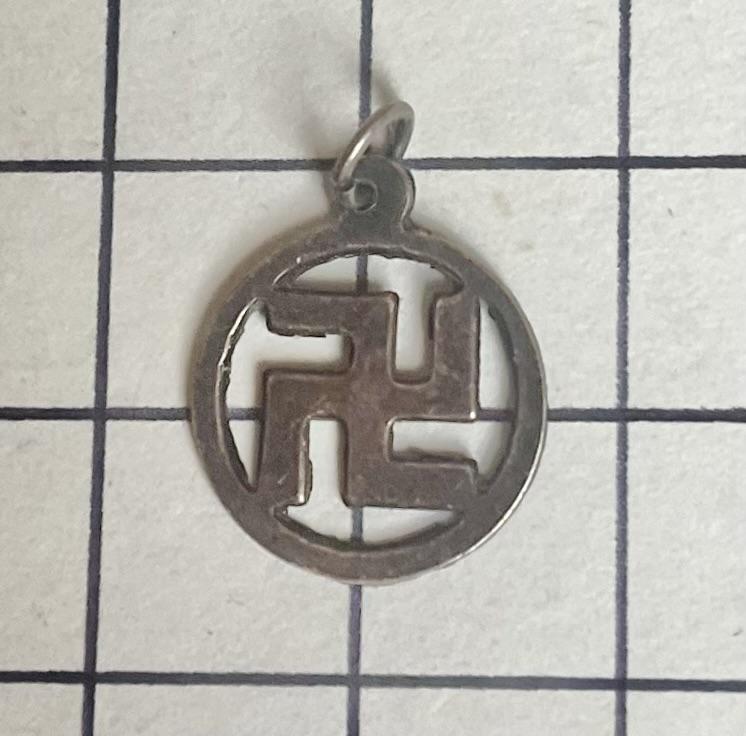 Small vintage pendant featuring a swastika symbol, commonly categorised as militaria or a historical collectible from the early 20th century. Although it came with other Nazi related items, it could also be another Nation's 'lucky charm'. Silver (unmarked) and nicely toned. GC.