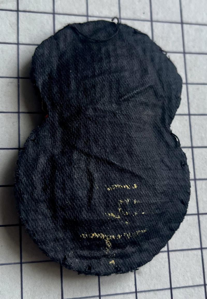 Waxed black cotton backing. Circa 7cm tall and 5cm wide at crown. Pre 1952. Blue jewel to centre of band of crown indicates this is a post 1920 issue. Colours bright. GC.