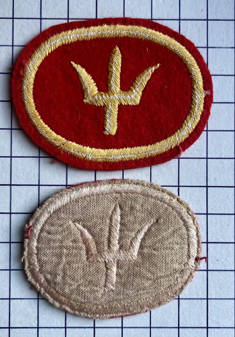44th (Home Counties) Div (Trident/Red Oval). Embroidered Military Formation arm badge c1955. Two examples (size). Removed from Battle Dress. GC.