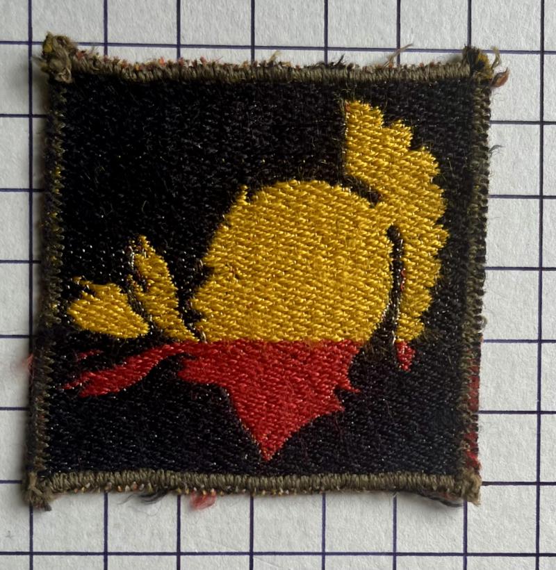 Rare, embroidered example. Black helmeted head of Mars belching flames bearing tank on horizontally divided RAC colours of yellow over red. Near VGC.