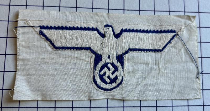 An M38 Kriegsmarine Navy Summer Issue Bevo Breast Eagle for EM and NCOs, flat BeVo weave construction in blue on a white backing patch. The breast eagle has no damage or repairs in good condition.