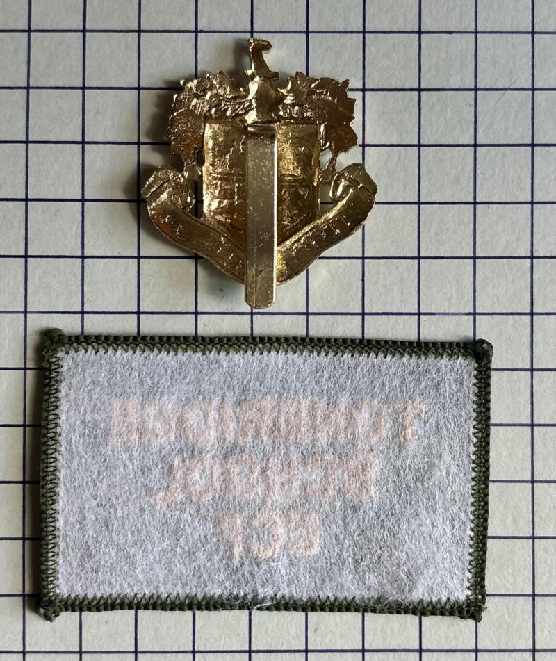 Tonbridge School C.C.F. staybrite cap badge with slider fitting to the reverse. The Arms of the school above the title scroll. With cloth embroidered shoulder title / arm / brassard patch. Both VGC.