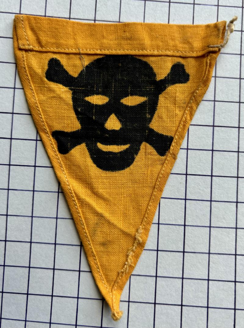 Yellow triangular cotton flag marker, stamped with Skull & Cross bones. First developed WWII as a 'gas warning' marker flag and subsequently used to mark mines and dangerous munition areas. Achtung Minen! VGC. Missing part of string.