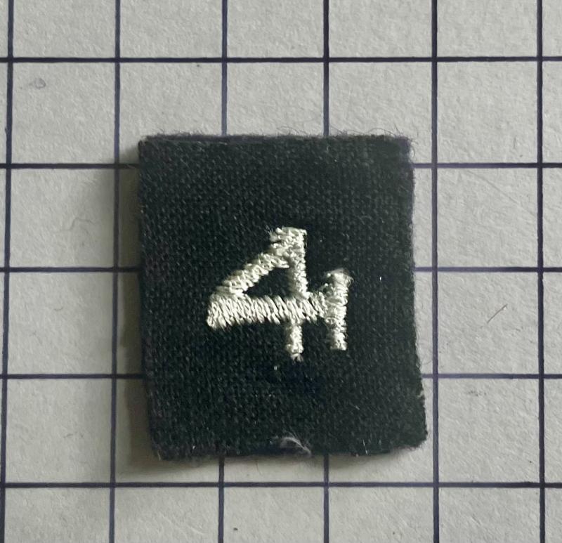 Nice R.O.C. arm badge numeral '4' for number 4 Group area. This would have worn below shoulder title for the designation of Colchester, Essex Gp. VGC.