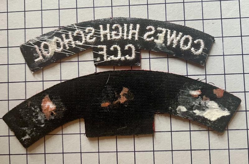 2 x variations of the Cowes High School C.C.F. shoulder title patch, both badges VGC. Some glue residue on reverse to one.