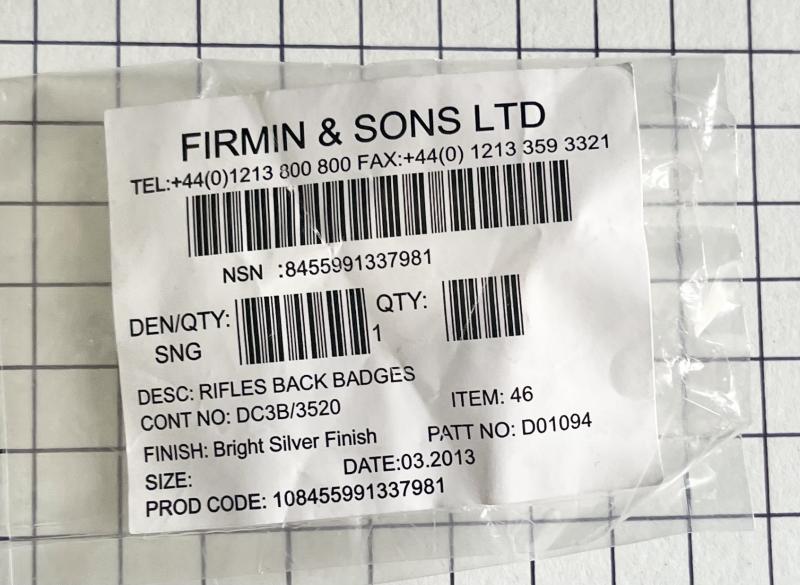 Unissued still in packet, a silver stove glazed 'new metal' Rifles Regt back badge. Sealed Firmin Packet is dated 2013. Worn on No1 / No2 Dress Rifles all ranks caps and ACF, CCF berets. Badge maker marked 'F&S' (Firmin & Sons). Mint.