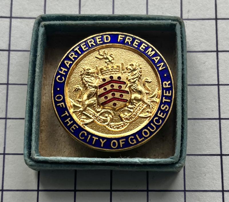 Lovely enamel Chartered Freeman of Gloucester badge. Maker 'H.W. MILLER Ltd BRANSON ST B'HAM. 18.' Comes in its vintage cardboard box. VGC.