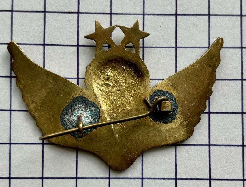 Afghan Army 2nd series qualification insignia. This is a heavy brass variation (1st Pattern) of the insignia which is also found in a light metal construction (2nd Patt). Two stars indicating class 2 qualification (of 3 classes). Cast brass pin backed. GC.