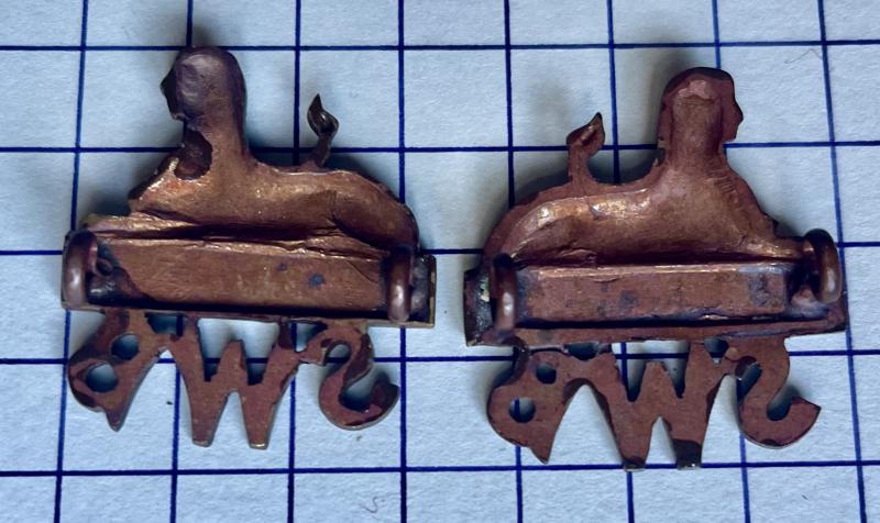 SWB matching O.S.D. collar badges same as figure 670 of Churchill's Army Infantry Collar Book. P. 109, as 'specimen' introduced 1928 and annotated '2nd Battalion.'