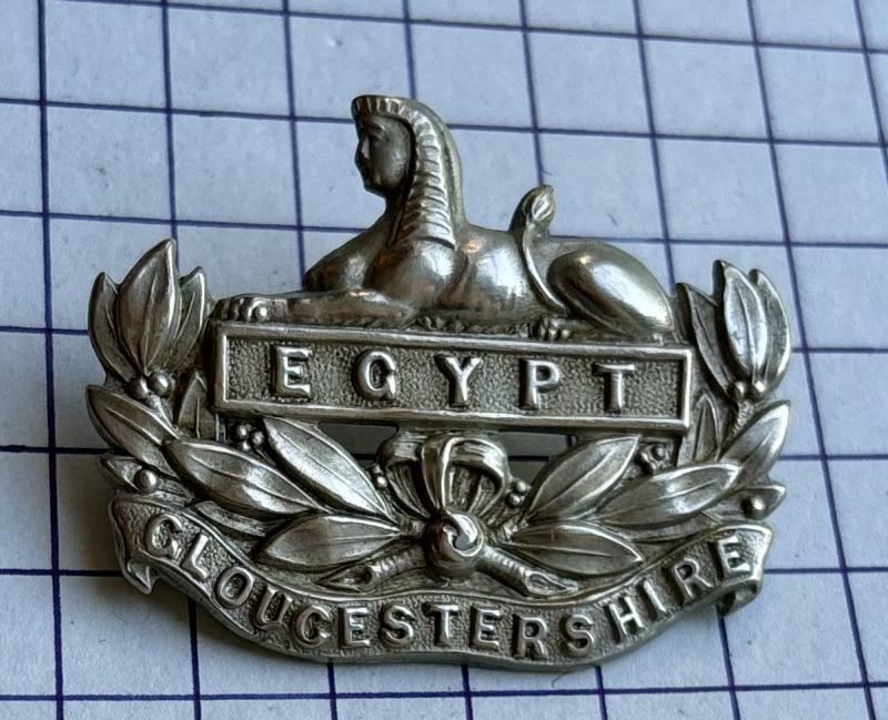 Scarce, a lovely Victorian / Boer War period, Other Ranks (ORs) Glosters cap badge. NB: with a 'higher silver mix' with copper (white metal) early version, on lovely dark Victorian era lugs. VGC.