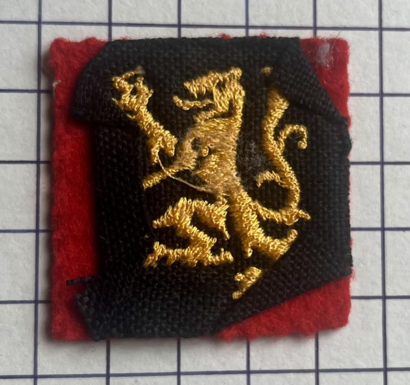 Higher formation, Scottish Command Troops HQ (UK). Formation sign patch being a heraldic 'lion rampant' in gold on a scarlet background, black gauze backing. VGC.