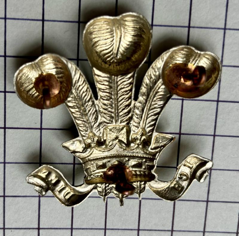 Good scarce, R.W.Y. Regimental Senior Non-Commissioned Officer's arm badge. Die-stamped white metal Prince of Wales's plumes and motto with brass coronet. Three loops. VGC.