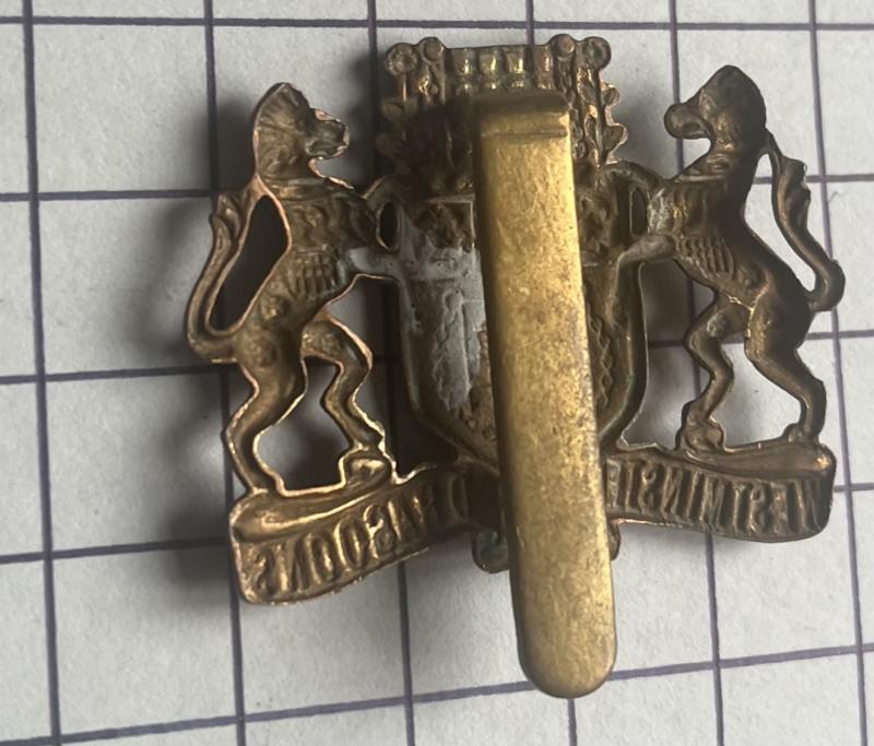 Westminster (Yeomanry) Dragoons 'TY' Scroll Brass Other Ranks brass metal cap badge on slider. VGC.