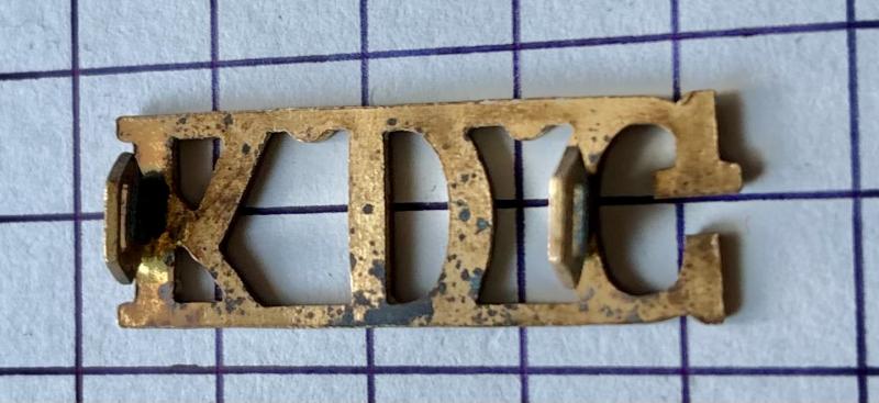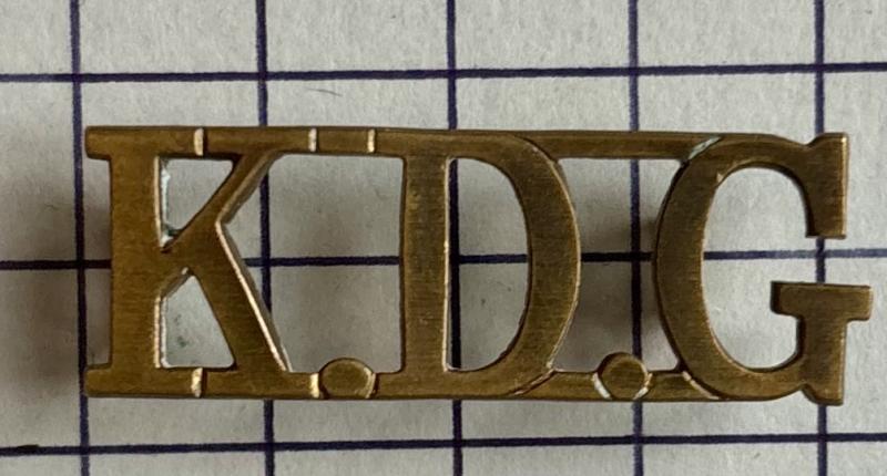 1st Kings Dragoon Guards (K.D.G.) Regt OR's brass title. VGC. Height 13mm. Width 38mm. Ref: Westlake 27.