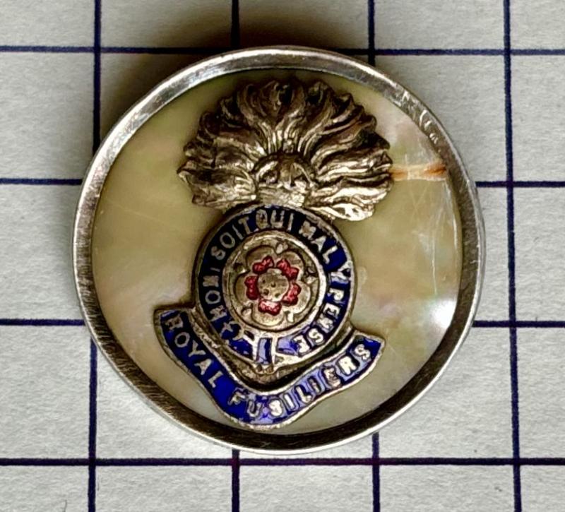 cWW1 Royal Fusiliers (RF) Mother of Pearl Silver Rim Sweetheart Brooch Badge