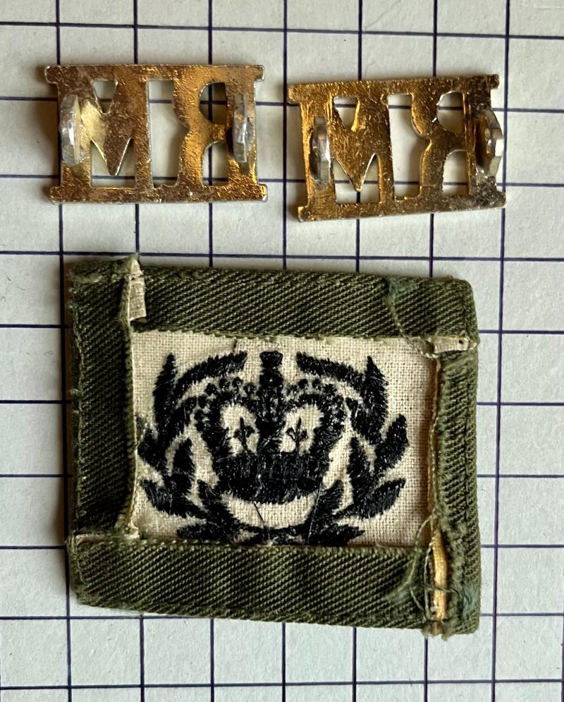 Subdued R.M. pattern WO2 rank tab and pr of ano shoulder titles, some light scratches / used. GC.