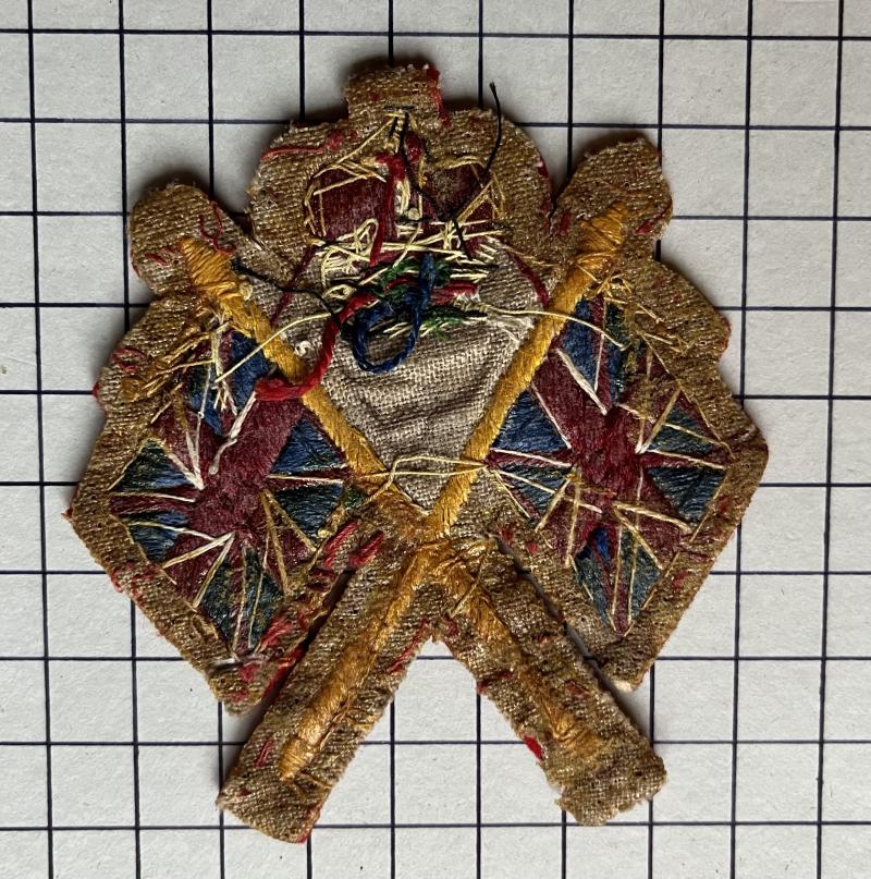 Nice early post 1952 large Recruiting Sergeant's rank arm badge. Crowned crossed Union Flags embroidered in bullion, velvet and silk on red cloth ground. Removed from tunic / brassard, and in near VGC.