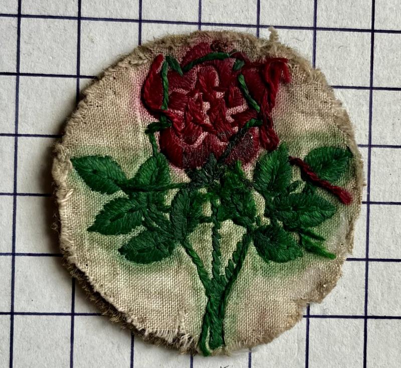 55th West Lancs Inf Div formation sign badge. A good embroidered red rose with green leaves and stems on khaki circle. Removed from uniform. GC.