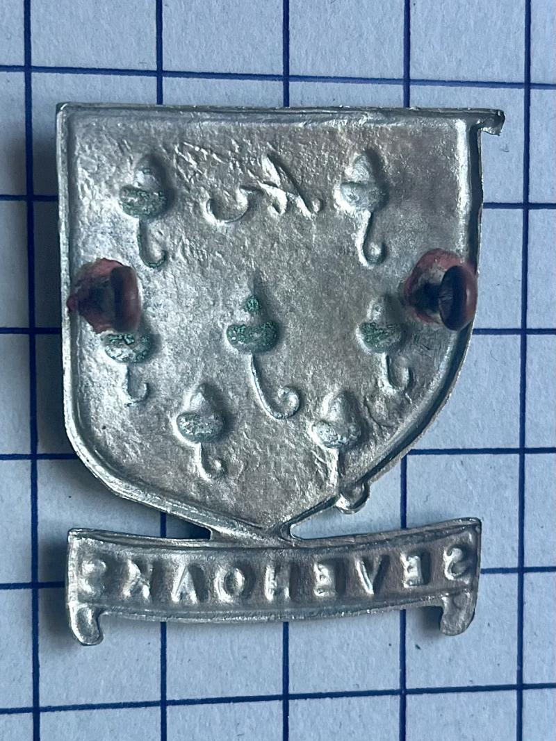 Sevenoaks School O.T.C. white metal cap badge. Die-stamped shield, charged with seven acorns and two Greek characters, resting on “Sevenoaks” scroll. VGC. Ref: KK 2680