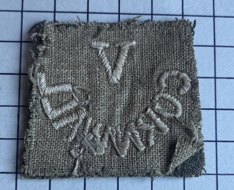 cWWI, cloth shoulder title 'V Cornwall'. A rare Great War example of the slip on shoulder title. White embroidered V/Cornwall on khaki. No tapes to the reverse. GC.